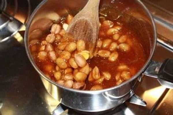 In un pentolino sciogliere lo zucchero con mezzo bicchiere di acqua (senza alzare troppo la fiamma per evitare che si bruci). Quando l’acqua comincia a diventare dorata, aggiungere le nocciole o le mandorle tritate o intere (questione di gusti), unire anche il burro e il succo di limone. Mescolare fino a rendere ambrato il composto.