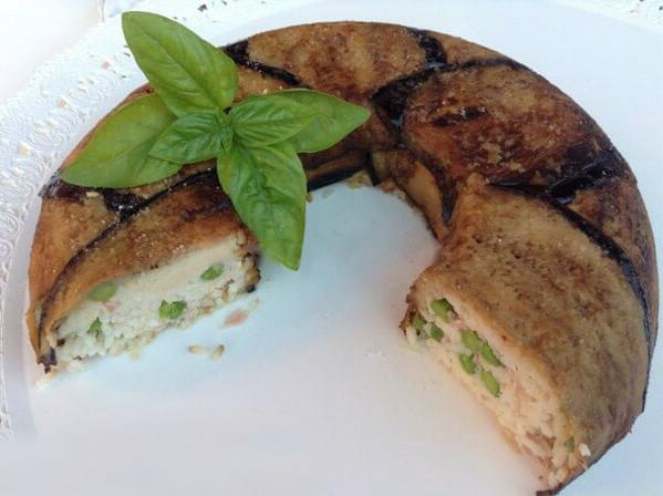 Lavare le melanzane e tagliarle a fettine spesse circa 1 cm; lasciarle in ammollo con acqua e sale per circa mezz’ora, asciugarle e friggerle in abbondante olio di oliva. Assorbire le melanzane su carta assorbente e salarle. Successivamente, cuocere il riso in abbondante acqua salata e i piselli in un altro pentolino. Scolare il riso e mantecare con burro e parmigiano. Prima di aggiungere gli altri ingredienti, lasciare intiepidire il riso. Imburrare e spolverizzare con il pangrattato uno stampo per ciambelle. Rivestire il fondo e i bordi dello stampo con le melanzane fritte precedentemente. Iniziare ad accendere il forno a 200° ed aggiungere al riso tutti gli altri ingredienti, quindi i piselli, il prosciutto cotto tritato e il formaggio tagliato a dadini. Amalgamare bene tutti gli ingredienti, controllare le giuste quantità di sale e aggiungere pepe nero e un pizzico di noce moscata. Versare il riso all’interno dello stampo e compattare con cura con fiocchi di burro. Infornare a 200° per 15-20 minuti e lasciare raffreddare la ciambella di riso prima di capovolgerla in un piatto da portata.